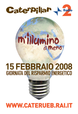 Aderisco anche quest'anno all'iniziativa di Caterpillar M'illumino di meno, sempre pi� convinto che il nostro modello di sviluppo non � pi� sostenibile sia per i danni ambientali, sia per il depauperamento delle risorse e la loro conseguente diseguale distribuzione, sia per le guerre che l'accaparramento di quelle restanti obbligher� a fare, sia infine perch�, tanto pi� esco dal mondo condizionante della pubblicit� e della televisione, tanto pi� mi accorgo che serenit�, felicit� e umanit� non sono affatto il frutto di questo sfrenato consumo.