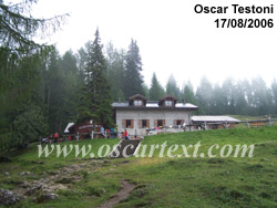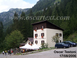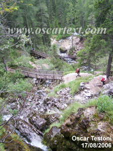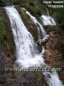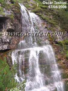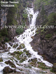 Scendendo dal Rifugio Casinei (1825 m), � possibile allungare la strada e invece di puntare diritti al Rifugio Vallesinella, attraverso il bosco per il sentiero 317, se il tempo nelsenso meteorologico tiene e c'� anche tempo nel senso cronologico, vale sicuramente la pena perdere quota pi�lentamente tagliando la Vallesinella con il 317b e nei pressi di Malga Vallesinella di sopra (1681 m) scendere per il sentiero 382 che attraversa le Cascate alte. Il sentiero scende ripidamente con passerelle di legno tra i vari rami delle cascate: ci si sente circondati e immersi nello spettacolo della natura, ovunque ci si volti c'� una diramazione: impossibile abbracciare il tutto con una sola foto Ecco a fianco alcune sequenze dall'alto fino in basso: nella prima foto uno scorcio dall'alto al basso del sentiero che taglia a zig-zag i rami secondari delle cascate; nella seconda si vedono le sorgenti (in basso a destra in particolare si vede in modo evidente l'acqua uscire dalla roccia); nella terza una delle tante cascate secondarie; nella quarta si vede il corso principale in cui si immettono da destra dall'alto al basso di volta in volta rami secondari, nella quinta uno dei rami secondari su cui si passa con una dei tanti ponticelli di legno; nella sesta infine si coglie uno spaccato pi� a valle di tre rami di cascate prima che si ricongiungano definitivamente in un unico ruscello. Un panorama in continua evoluzione mano a mano che si scende. Il sentiero e i sassi sono umidi e scivolosi: occorre fare molta attenzione. Sotto ci sono le foto del Rifugio Casinei (1825 m) e il Rifugio Vallesinella: a quest'ultimo si giunge con un servizio di pulman da Madonna di Campiglio. Oscar Testoni 11/04/2007   |     | ||||||||