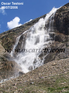L'interrogativo è d'obbligo. Queste cascate, che, come si pu� constatare dalla foto, sono ben visibili, fragorose, ricche d'acqua, con un salto di tutto rispetto, certamente di gran lunga superiore a tante cascatelle vicine ai paesi indicate con tanto di roboanti targhette turistiche, non hanno un nome (almeno che io sappia), non se ne parla nelle guide e non sono nemmeno segnate come tali sulle cartine escursionistiche (la Tabacco 1:25.000 mette l'icona della goccia, che significa sorgente, per le altre in mio possesso non c'� traccia). Riconosco che in prossimit� dei ghiacciai � facile trovare acqua di scioglimento che ruscella velocemente verso valle, ma qui questo ruscello si presenta nella forma classica della cascata e - ripeto - neanche pi� piccola o meno speccolare di tante altre che hanno normalmente questa classificazione. Come chiamarala dunque?