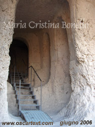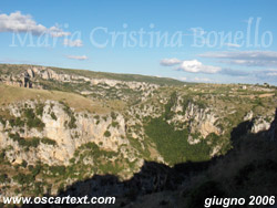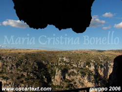 Ora � un'improvvisa fuga verso l'infinito che si apre a scorcio incorniciata da un arco, o da una rude finestra bucata nel tufo, o dall'ultimo spigolo di una chiesa a strapiombo sulla gravina: uno squarcio su un arido e sconfinato altopiano coperto da bassa erba che si perde lontano. Una fuga incorniciata, che non � mai un fuggire davvero, ma solo il respiro che d� aria alle case, alle piazzette, alle viuzze e per contrasto esalta il paese.