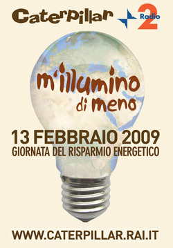 Dal 2007 aderisco all'iniziativa di Caterpillar M'illumino di meno. Vi aderisco con la consapevolezza che il problema posto dal nostro sviluppo - sia in termini di danni ambientali che in quello di depauperamento e di diseguale distribuzione delle risorse - non sia pi� rinviabile. Vi aderisco anche perch� ho la sempre pi� netta sensazione che tra spreco delle risorse e qualit� della vita NON vi sia un rapporto direttamente proporzionale, e quindi, senza credere di dover regredire, auspico uno sviluppo scientifico e tecnologico sempre pi� in funzione dell'umanit� e del suo pianeta e sempre meno in funzione del mercato. Vi aderisco NON come ad un atto simbolico, che ogni anno mi porta a risparmiare il giorno dell'anniversario del protocollo di Kyoto, bens� come ad un cammino che mi consente di allenarmi in stili di vita che mi portano ogni volta ad acquisire abitudini e ad adottare cautele che continuo a praticare sempre nella mia quotidianit� e a coinvolgere sempre pi� persone in un atteggiamento responsabile verso le comuni risorse della terra. Come? Ecco di seguito i propositi in cui mi sono allenato nelle edizioni a cui ho partecipato fino ad ora.
